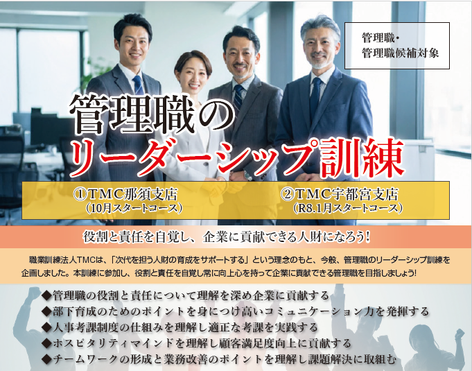 令和7年度 管理職のリーダーシップ訓練 10月・R8 1月開講 TMC職業訓練校 令和7年度「管理職のリーダーシップ訓練」開講のおしらせ今後の情勢により日程が変更になる可能性がありますので御了解ください。 詳しくは、■認定職業訓練一覧をご覧ください。